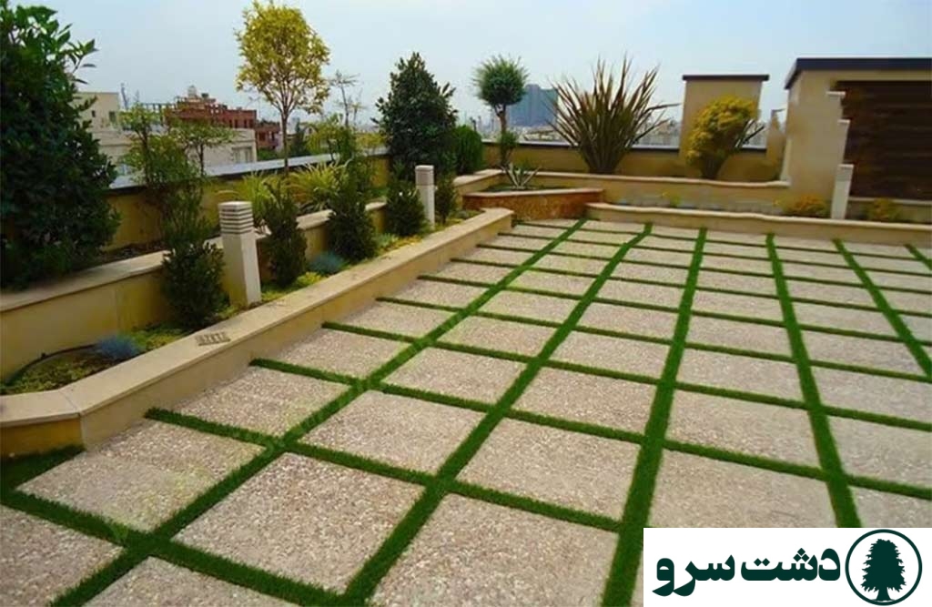 حیاط و روف گاردن همیشه سبز، بدون نیاز به آبیاری و هرس، کاهش وزن سازه در روف گاردن، ایده‌آل برای حیاط‌های کوچک. چمن مصنوعی برای حیاط کوچک، طراحی فضای سبز با چمن مصنوعی، سبز کردن خانه با چمن مصنوعی
